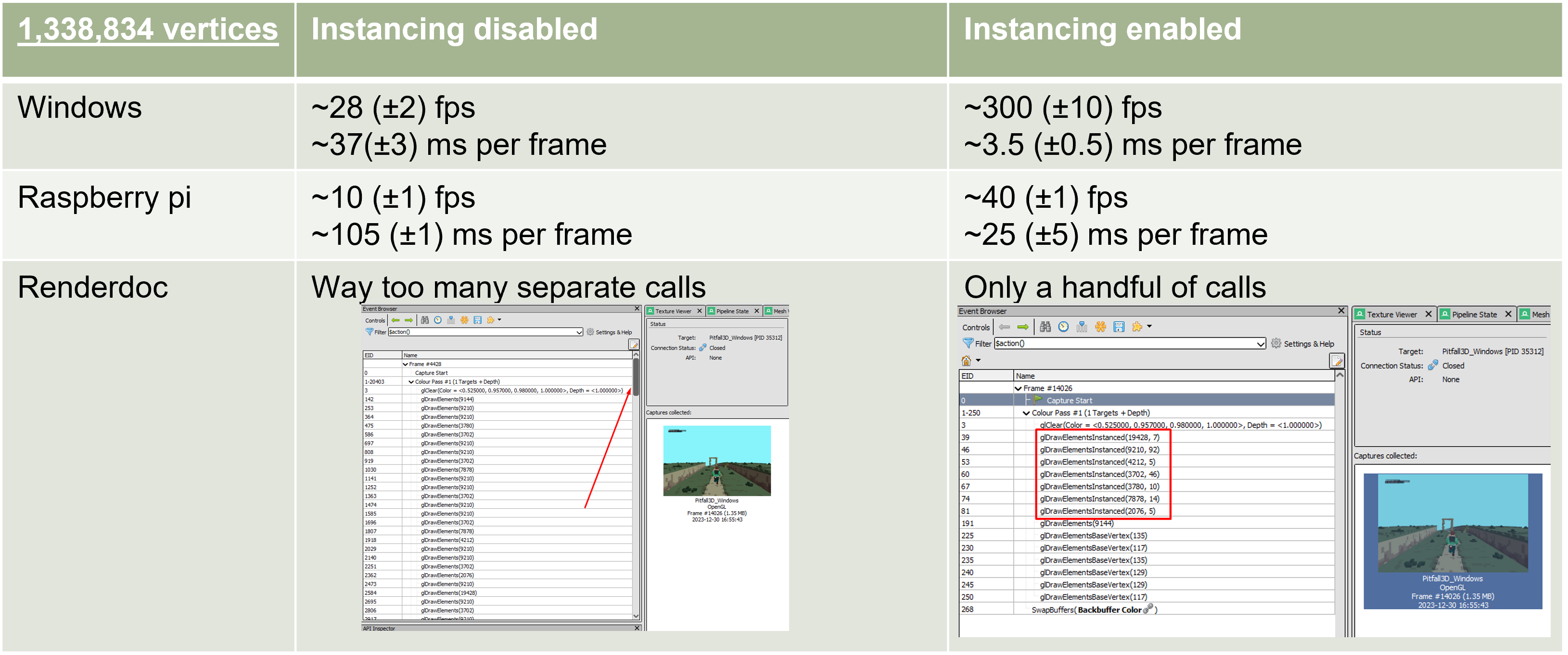 Image below shows the difference between having no instancing and having instancing enabled.